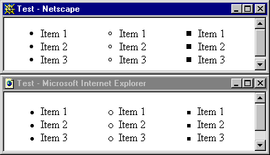 <table width=100%> <tr><td> <ul type=disk> <li>Item 1 <li>Item 2 <li>Item 3 </ul> </td><td> <ul type=circle> <li>Item 1 <li>Item 2 <li>Item 3 </ul> </td><td> <ul type=square> <li>Item 1 <li>Item 2 <li>Item 3 </ul> </td></tr> </table>